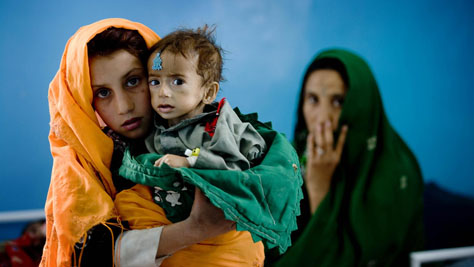 A girl holds her malnourished nephew at a UNICEF-supported therapeutic feeding unit in Mirwais Hospital, in Kandahar, capital of Kandahar Province, Afghanistan. They are waiting with family members. The unit treats an average of 300 children per year, from all over the region. Due to ongoing conflict, few humanitarian groups can operate safely in the area.